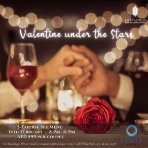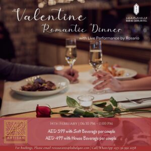 Music makes everything extra special, hence Rosario’s live performance will serenade you and your partner to feel the love at the stylish all-day dining restaurant, Artisan Kitchen, with their locally farmed produce and delicious Arabic specialties. Starting from 6:30 pm to 11:00 pm, make your Valentine’s celebration a memorable one for only AED 399 that comes with soft beverages per couple, or opt for house beverages for only AED 499 per couple.